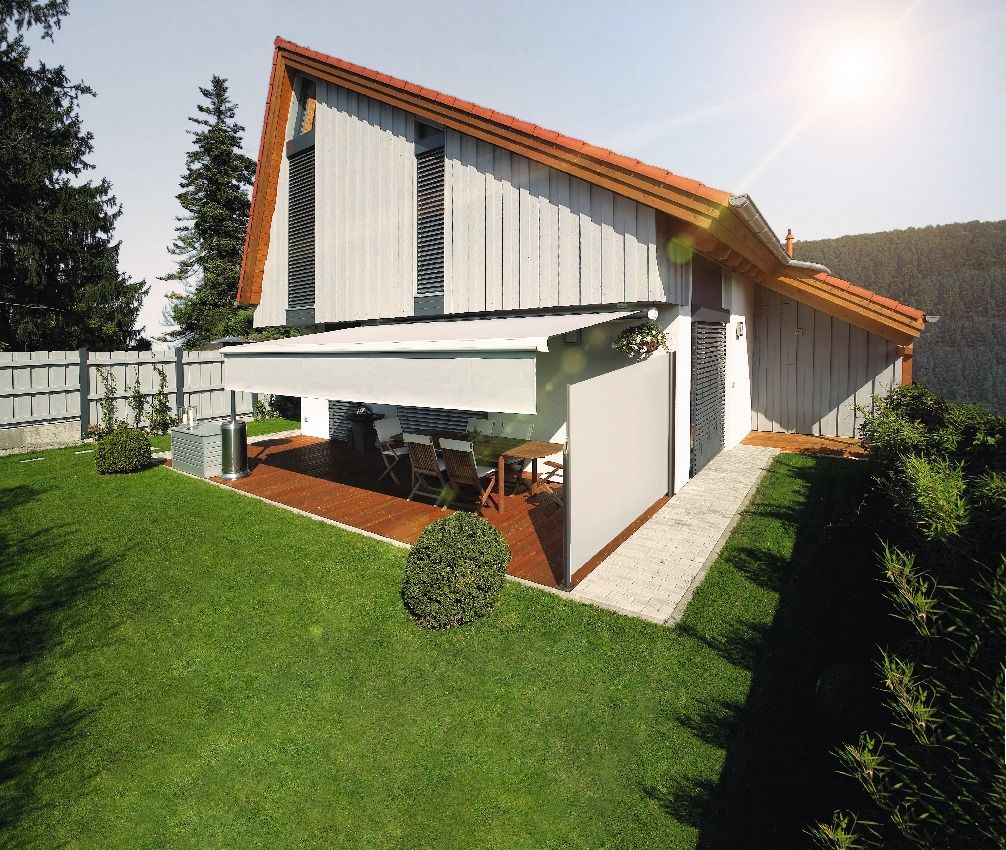 Sie lassen sich per Kurbel oder elektrisch an den Seiten der Hauptmarkise auf und nieder fahren. Sie schützen die Terrasse vor seitlicher Sonne und vor den Blicken der Nachbarn.
